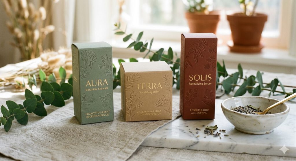 drei Kostmetikschachten hochkant aufgereiht