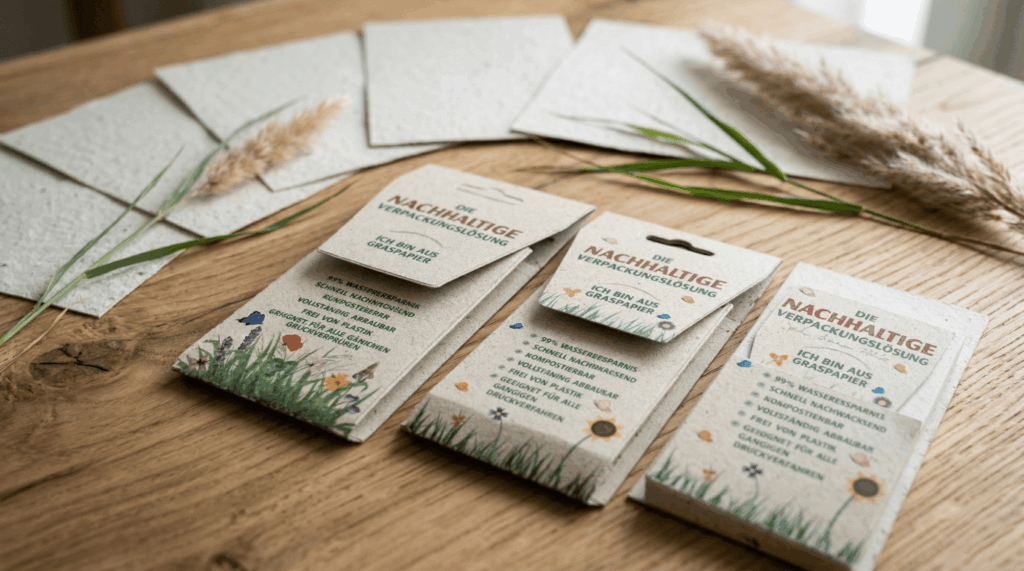Zugegeben, wir sind nicht die Erfinder des Graspapiers, waren aber sofort hellauf begeistert von dieser ressourcenschonenden Alternative für herkömmliches Papier und Kartonagen.